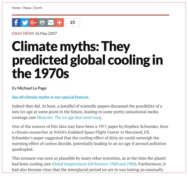 《新科学家》杂志(NewScientist)2007年一篇报道称科学家在1970年代确实做出了全球变冷的预测。