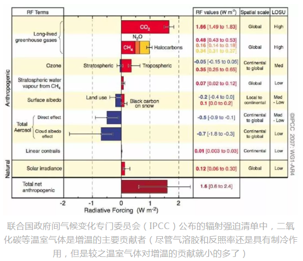科学界对工业排放的不同物质之于大气热平衡的作用有了新的认识。尽管人为气溶胶总体上还是具有制冷效应,但温室气体对大气的加热作用已经大大超出了气溶胶的制冷作用。因此,与温室气体排放相联系的化石能源使用被认为是导致全球变暖的主要原因。