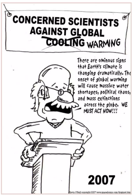 这时候,那些曾在七十年代呼吁学生遏制全球变冷的教授们也不得不将教案改为“全球变暖会导水资源短缺、全球动荡和生物大灭绝,我们必须从眼下开始行动!