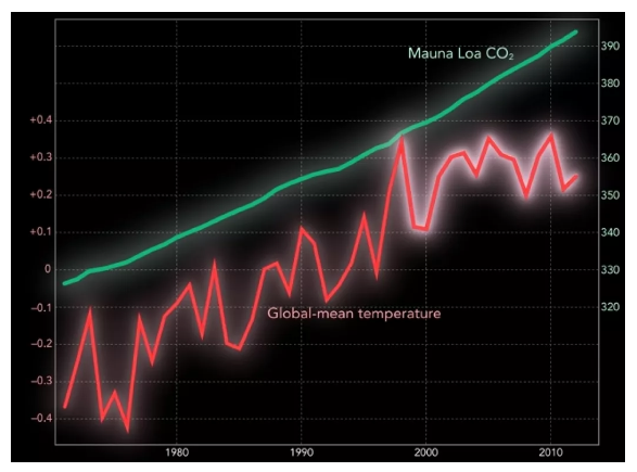 然而,好景不长,1998-2012年间的观测记录显示全球气温并没有像科学家预期的那样与全球二氧化碳变化同步增加,而是一个出现了增长趋势上的“停滞”(hiatus),即没有继续随着全球大气二氧化碳的不断增长出现线性增长,而是维持在已有的状态。