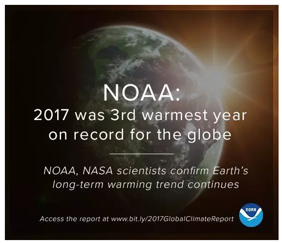 幸好,2012年以后的观测数据没有继续停滞。刚刚过去的2017年仍是有记录以来第三最暖的一年(过去138年的记录中最暖的一年是2016年,第二暖的一年是2015年)。
