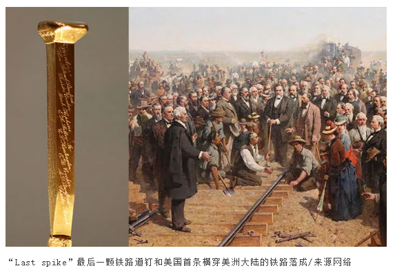 “金钉子”原本不是地质学的名词,它来源于人类的铁路修建史。1869年,美国首条横穿美洲大陆的铁路贯通,这条铁路对美国的发展意义极其深远。为了纪念铁路的成功修建,铁路落成庆典上,在最后一根特制月桂枕木上,钉下了最后4颗有特殊意义的特制道钉,其中2枚含有成色不等的黄金。最后一枚道钉含17.5克拉黄金(73%成色,18K金),重436g。这枚“最后的道钉(The Last Spike)”,四面刻有太平洋铁路的奠基和竣工日期、铁路指挥长等官员的姓名,并提有“May God continue the unity of our country, as this railroad unites the two great oceans of the world”(就像这条铁路连接世界两大洋那样,愿上帝使我们的国家继续统一)等字句,顶端刻有“LAST SPIKE”标记。随着最后一枚黄金道钉的楔入,太平洋铁路这项伟大工程也标志着胜利竣工。