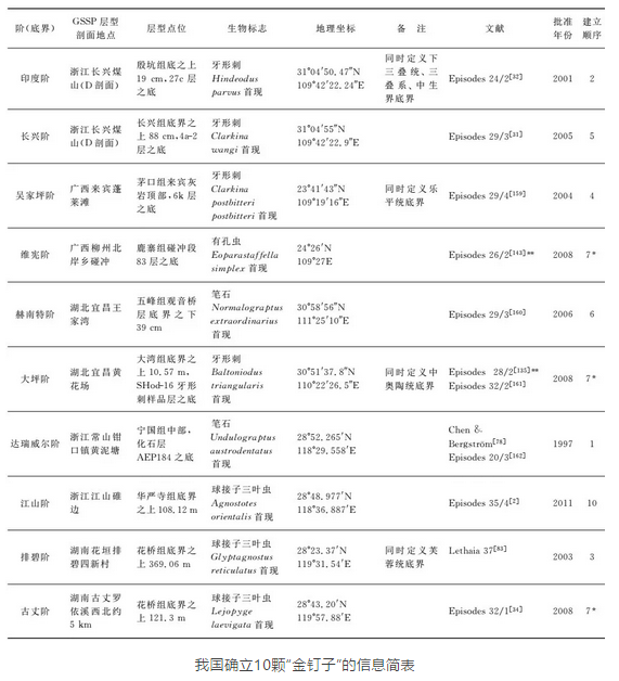 在我国建立的10枚“金钉子”分别指:寒武系第三统古丈阶全球标准层型剖面和点位、寒武系芙蓉统排碧阶全球标准层型剖面和点位、寒武系芙蓉统江山阶全球标准层型剖面和点位、奥陶系中奥陶统大坪阶全球标准层型剖面和点位、奥陶系中奥陶统达瑞威尔阶全球标准层型剖面和点位、奥陶系上奥陶统赫南特阶全球标准层型剖面和点位、石炭系密西西比亚系中统维宪阶全球标准层型剖面和点位、二叠系乐平统吴家坪阶全球标准层型剖面和点位、二叠系乐平统长兴阶全球标准层型剖面和点位、三叠系下三叠统印度阶全球标准层型剖面和点位。