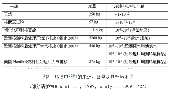 正如我们在前期文章指出的那样(神奇的碘元素:从加碘食盐到环境示踪剂),自然界有一种放射性核素129I就可以承担示踪核活动和核环境安全水平的历史使命。究其原因,这就要从129I的来源说起,129I是碘的长寿命放射性同位素(半衰期为15.7百万年),一般来说宇宙射线与大气中的129Xe反应生成途径是天然129I的主要来源(宇宙射线和它的孩儿们——宇生核素)。据估算,天然生成的129I只有250 kg(图3),而人类进行大气核试验过程中核裂变,核事故以及核燃料循环才是环境中129I的主要来源。20世纪50年代以来的大气核武器试验产生了约50-150 kg的129I,使得全球129I的环境水平提高了至少100倍。前苏联的切尔诺贝利和日本的福岛核事故释放的129I约有7.2 kg,而位于欧洲的Sellafield (英国)和La Hague(法国)的两大核燃料后处理厂自20世纪60年代以来向环境中释放了超过6000kg的129I,是目前129I的最大来源,造成欧洲,特别是北欧的129I水平比我国环境水平高约100倍。