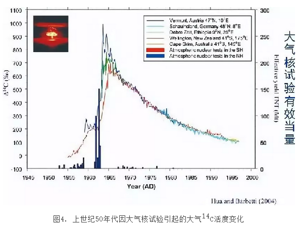 除此之外,还有一种放射性核素14C也是核武器试验的重要产物。14C是碳的一个长寿命放射性同位素(半衰期为5730年),除宇宙射线与大气中的14N反应生成的天然14C外,环境中14C主要来源于大气核武器试验中的核聚变和核裂变、核电站中的活化反应等。20世纪50年代以来的大气核武器试验造成大气中14C的浓度(通常采用Δ14C来表示,单位为‰)从-25‰提高到900‰,随着大气扩散、与水圈等其他圈层的交换作用和化石源燃料燃烧等,大气中14C浓度不断下降到约20‰(图4)。虽然其他放射性核素如90Sr、131I、 137Cs等也可示踪人类核活动,但它们都是半衰期很短的核素,要么很快衰变完无法用仪器测试,要么主要以颗粒结合沉降。14C和129I这两种核素均为长寿命放射性核素,不会很快衰变完。核武器试验后均以气态形式释放并存在于环境中,可以随着气团快速传输。例如,2011年的日本福岛核事故发生一周后,在欧洲检测到放射性碘信号,两周后在我国也检测到微弱的信号。因此,129I和14C这两种长寿命放射性核素是核试验和核事故的理想示踪剂,能够很好地评估核环境安全。