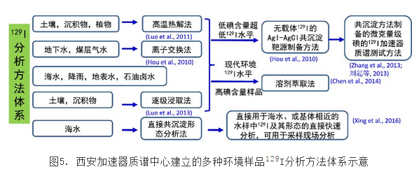 为了能够有效地开展我国核环境安全水平监测工作,中国科学院地球环境研究所西安加速器质谱中心的环境放射性研究团队经过几年努力,已经建立了包括水、土壤、大气、植物等多种类型样品129I核素测试分析方法体系,为开展核环境安全水平监测提供了有效途径(图5)。