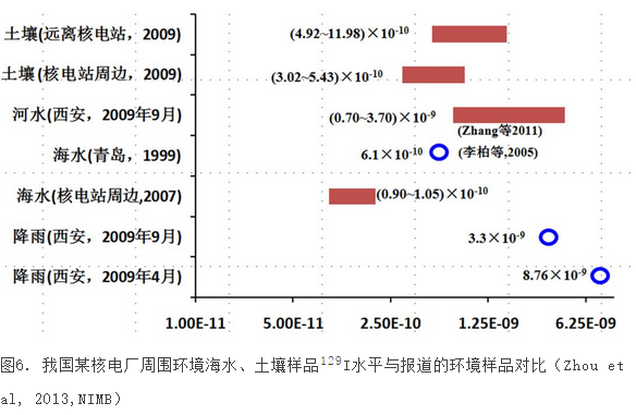该团队曾经对我国一个正在运行的核电站周边环境的129I 水平进行了调查分析,结果与报道的大范围环境大气沉降本底水平一致,这说明没有明显可测量的129I 从核电厂排放到海水中,其周边环境安全可靠(图6)。