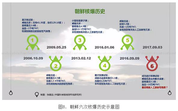 据地震分析表明,此次核试验与前五次试验一样,都是在咸镜北道吉州郡丰溪里试验场进行的地下核试验(图8)。据估计,此次核爆的威力约为108千吨TNT当量,高于朝鲜历届核爆,已达到了美国1945年投放在日本长崎的“胖子”原子弹威力的3至7.8倍。“胖子”的爆炸造成了约四万人的直接死亡,约二万五千人受伤,约7000平方米的建筑物被夷平,之后数万人死于放射性尘埃引起的癌症。由此可见,朝鲜第六次核试验的威力之大。虽然此次核试验为地下核试验,大部分放射性物质都被封存在试验横井或竖井中,但是如果存在操作失误等问题,放射性污染物会通过山体裂缝释放到环境中,对环境造成难以估计的辐射危害。