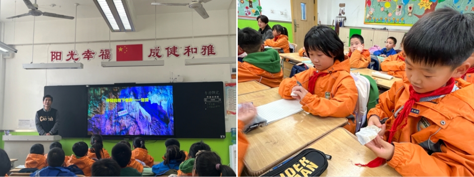 2024年11月20日,中国科学院大学“春分工程”青少年科普专项行动在开元小学开始了第一期科普课程。中国科学院地球环境研究所研三学生吴昊阳作为科普讲解员为3.3班学生带来了一节生动有趣的科普课程 《神秘的地下世界——溶洞》。在吴老师的讲解下,同学们依次了解了溶洞里有什么?溶洞是怎么形成的?溶洞景观的形成过程,欣赏了喀斯特地貌,钟乳石景观,认识了洞穴中的生物,溶洞的科学价值等。吴老师还带来了石笋和流石品指导学生进行观察,这样的操作与观察,让学生对洞穴沉积物有了更进一步的了解。课堂上,同学们兴趣盎然,认真观察思考,和吴老师积极互动,争相回答问题。课后,同学们围在吴老师身边继续探讨交流,纷纷表示期待下一次科普课早点到来。