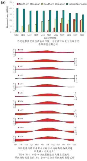 a: 青藏高原隆升与东亚季风演化。利用美国大气海洋研究中心(COLA)的全球大气GCM(R15L9)完成了青藏高原不断隆升的一组(共11个)数值试验。基于数值试验结果及前人工作认为,即使高原尚未大幅度隆起的情况下,在南亚地区因行星风带的季节转换及海陆之间的经向热力对比就足以激发具有一定强度的热带季风,但只有当高原隆升达到较高的高度时,主要受东西向热力对比控制的东亚季风才能出现在30°N以北的中纬度地区。