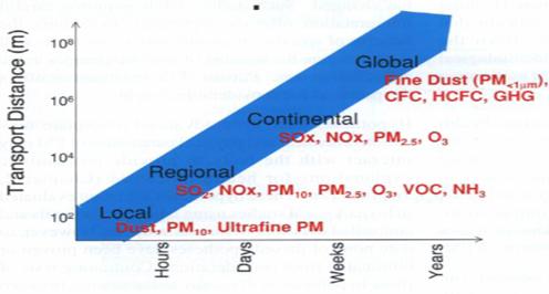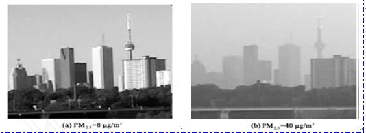 大气颗粒物污染引起的能见度效应发生在两个空间尺度:局地和区域性的。局地的烟雾污染可降低能见度,这一过程有时被称为烟羽效应。该情况主要是由近源一次污染物引起的。广域污染可引起数十或数千公里的区域性霾。很多排放源都对区域性霾的形成有贡献,由于传输时间长(通常数小时或数天),区域性霾主要是由二次粒子引起的。