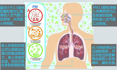 首先,颗粒物经过人的呼吸系统进入人体,直接受到影响的就是肺。PM2.5之所以对人体危害大,是因为它可以吸到肺里去。而且,小颗粒甚至可以直接进入血液及其他器官。一个人平均每天大约呼吸一万升空气,一旦空气含有污染物,人体健康就必然会受到危害。