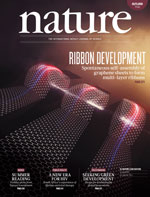 本期封面所示为来自一个单层主体石墨烯层的三个 “丝带”的并行自组装。20多年前,人们设想石墨烯可被折叠和剪切成有用形式,如一种纳米尺度的折纸。在本期《自然》上,James Annett 和Graham Cross描述了一个系统,在其中单层石墨烯能通过一个折叠、滑动和撕破的过程将自身重组成三维结构。当一小片石墨烯被折叠接触到其本身时,它自然会开始滑动,并在这个过程中撕成一条带状结构,就像丝带一样。当一个动能能障消除时,这种二维材料能合并成我们更熟悉的三维分层形式。这一“剥皮” 现象的驱动因素是一个热力学机制,该机制很稳定,即便是在室温下的空气中也足以能够在大面积内发挥作用。这些发现有望成为以机械方式促动二维材料的一个新机制以及将它们组装成复杂三维架构的一个新方式。