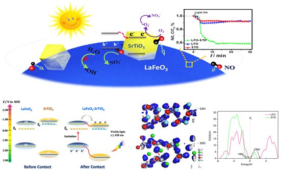 与传统单相催化材料的固有能带结构相比,构建异质结催化材料不仅能调控材料的光照吸收阈值,还可以通过调控能带结构实现光生载流子的快速分离,降低电子空穴的复合程度,提高光催化降解污染物的效率。此外,在光催化降解污染物的反应过程中,异质结的界面结构特性决定了界面上载流子的转移与传输方向、污染物的吸附特性和活性基团的反应活性等。鉴于此,该课题组研究人员利用Bi系层状结构有利于电子转移的特性,以(BiO)2CO3为基础,采用原位热分解法制备了具有良好循环稳定性与可见光活性的α-Bi2O3/(BiO)2CO3异质结催化材料,大幅提高了光生载流子的分离效率(Scientific Reports, 2016, 6, 23435)。随后,研究人员利用g-C3N4自牺牲提供CO32-基团,通过一步水热法巧妙地合成了厚度可控的Bi2O2CO3/g-C3N4层状异质结纳米盘(图1)。通过形貌调控和异质结协同催化作用,该异质结对NO的去除效果显著增强,深入研究发现超氧自由基是该异质结降解NO过程中的主要活性基团(Applied Catalysis B: Environmental, 2016, 199, 123,IF:8.3)。另外,新型钙钛矿型复合氧化物由于ABO3的钙钛矿结构具有更大的结构容忍度,其结构和性能调控的范围较大。因此,通过调控晶格结构相似的两种钙钛矿材料制备了LaFeO3-SrTiO3(LFO-STO)异质结光催化材料。实验结果和密度泛函理论(DFT)计算表明:LFO-STO异质结的构建形成了内建电场,能带位置发生变化,界面光生载流子转移和传输具有了全新的驱动力,利于光催化降解污染物的反应过程(图2)(Applied Catalysis B: Environmental, 2017, 204, 346, IF: 8.3)。此外还发现,纳米Ag可以利用表面等离子共振效应吸收可见光并转移激发态电子至SrTiO3,形成活性氧自由基,提高SrTiO3在可见光下的光催化NO去除效率(图3)。纳米Ag负载量与光催化去除性能在一定范围内具有正相关关系,通过改变Ag负载量可间接调控光催化能力,表面碱性位点(Sr2+)的存在有利于抑制NO2的生成(ACS Applied Materials & Interfaces, 2016, 8, 4165)。在之后的研究中,发现合成的Bi/ZnWO4光催化材料也具有类似的等离子体效应(ACS Sustainable Chemistry & Engineering, 2016, 4, 6912)。该系列研究为设计具有高效选择性纳米光催化材料提供了新的思路。