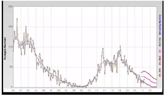图1 太阳活动进入下降年,月平均黑子数不断减小