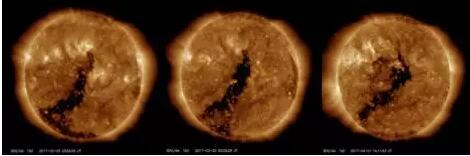 在太阳活动下降年,冕洞频繁地登上太阳活跃的舞台。冕洞是高速太阳风的源头,它喷出的高速等离子体流随太阳自转以27天左右为周期扫过地球。这些周期性出现的太阳风高速流能够引起地球磁场强烈“地震”,在近地空间外辐射带内掀起高能电子的“海啸”——高能电子暴。图2所示为同一冕洞分别在2017年2月25日、3月25日及4月21日经过日面中央时的形态变化。该冕洞喷发出的高速流到达地球,造成三月上旬、三月底至四月初、四月底至五月初近地空间高能电子通量上升几个量级,事件持续时间最长达14天。