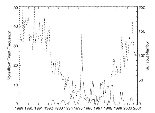 图5 1989年至2001年低轨卫星 DMSP 发生表面充电事件的概率(实线)和太阳黑子数(虚线)随时间的变化情况