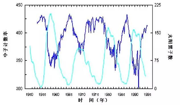 那么太阳活动强弱对银河宇宙线的影响如何呢?这得从源自太阳的行星际磁场说起。在太阳活动高年,太阳磁场也较强,稠密的磁场会把宇宙射线粒子阻挡在太阳系外部,也就自然的形成了一道安全的屏障。而太阳活动低年时,太阳磁场较弱,银河宇宙线就会“趁虚而入”。图6反映了在不同的太阳活动时期,行星际磁场对银河宇宙线的阻挡作用。如图可见,受到太阳活动周的影响,宇宙线强度变化也表现出明显的11年的周期变化。太阳活动高年时行星际磁场的作用增强,太阳系内部的银河宇宙线强度较弱,相反在太阳活动低年银河宇宙线强度达到峰值,其结果就是在人类空间活动频繁的地球周围造成负面影响。