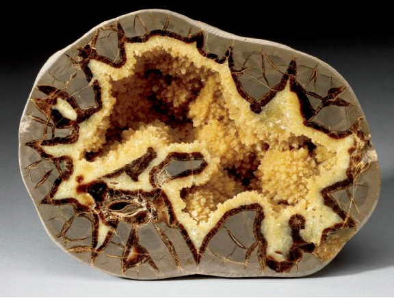 岩石中的孔洞给矿物生长成为晶形完美的晶体提供了不受阻碍的空 间。而结果是只有少数几种晶体,如天青石、萤石等会在空腔中朝 着内部方向生长,在龟甲石内部的尖角空腔中生长方解石(如右边 的照片所示)。经过风化作用,或者人类的力量,这些保存下来的 晶体从岩石中显露出来,被称作“晶洞”,是非常流行的矿物收藏品,也经常被当作装饰品。