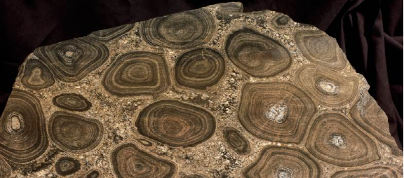 球状花岗岩,产于芬兰, 99×74×31 厘米。这种不太常见的侵入岩有独特的外观,只因它具有球状体——同心层状球形结构。这种球状花岗岩被认为是一些岩石颗粒在冷却的岩浆室中结晶形成的