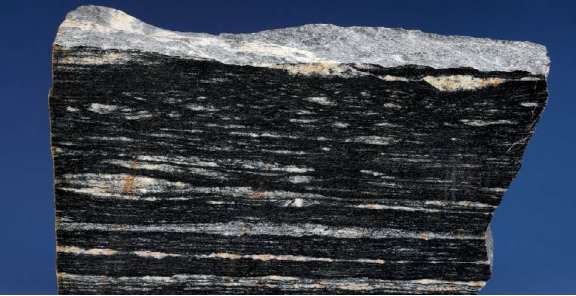 艾加斯塔片麻岩(冥古宙英云闪长岩),产于加拿大西北地区的斯拉维克拉通(也叫奴隶克拉通),9×9×6 厘米。位于加拿大耶洛奈夫以北 300 千米(185 英里)的一座岛上。 艾加斯塔河矿床被认为已经有 35 亿至 40 亿年的历史——是地球上已知最古老的岩石之一