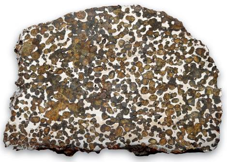 斯普林沃特陨石上的抛光薄片,它是一块发现于加拿大萨斯喀彻温省斯普林沃特的石铁陨石, 20×14×1.4 厘米,1.85 千克