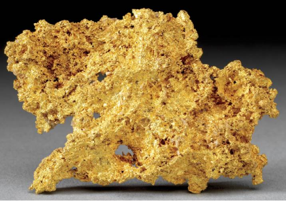 ◇晶体习性:金黄色,随着其中混入的银越来越多会逐渐变为银黄色, 或者随着铜的替换而变为橙红色。可以是八面体、十二面体和立方晶体或圆形,也可以是网状、树突状、树枝状、薄片状、纤维 状或海绵状,块状,圆形的金块,或为鱼鳞片和碎片状。金属光泽; 不透明(除了最薄的金箔以外)。通常很粗糙。黄色条痕。