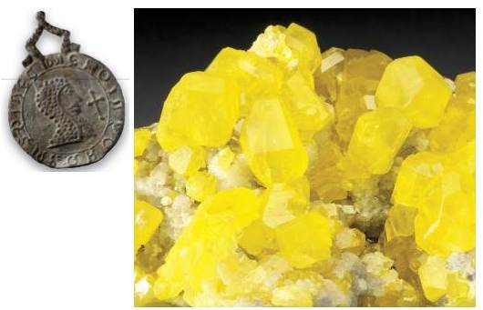 右:硫,产于意大利西西里岛,9×10×11 厘米