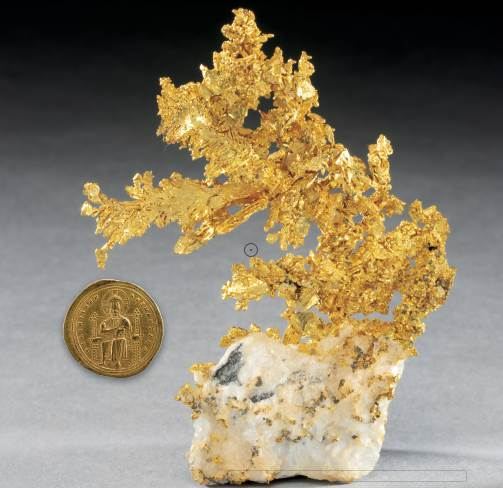 右:从石英中结晶出的金,产于美国加利福尼亚州普 莱瑟县,8.5×6.5×2.5 厘米