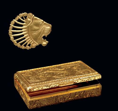 下: 香烟盒(俄罗斯,约 1912 年),18K 黄金并雕刻有叶片形状的纹饰, 7×5×1 厘米。在 19 世纪末,香烟盒与打火机开始成为一种个人装饰品。到 了 20 世纪初,俄罗斯、法国和英国都制造了许多精致的香烟盒。这个时期的俄 罗斯香烟盒上面有花卉和几何图案,并因由彼得·卡尔·法贝热(Peter Carl Fabergé)设计而十分著名。第一次世界大战后,吸烟被认为是一件时髦的事情,巴黎成了香烟盒设计中心。