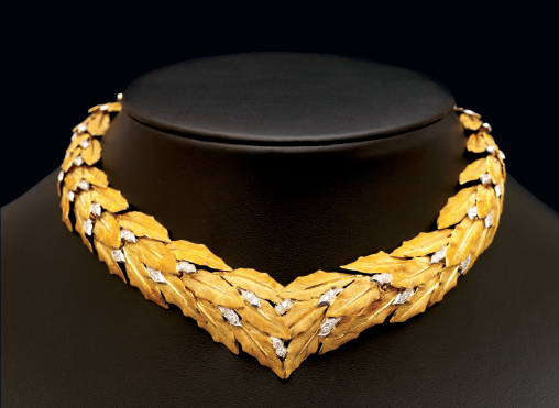 项链,布切拉蒂(英国,大约 1970 年),金镶钻,20×15×0.5 厘米。钻石和 黄金是在世界上经常一起被使用的昂贵珠宝。世界上最令人向往的奢侈品中,有 很多来自梵克雅宝(Van Cleef & Arpels)和布切拉蒂(Buccellati)公司,经 常有王公贵族、电影明星和富有的社会名流光顾这里。
