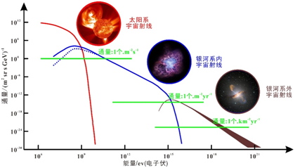 银河系宇宙射线来源于银河系内超新星的爆发,其由约87%的质子和约12%的α粒子等组成,能量多在0.1GeV-100GeV之间变化,能量高,通量较低。