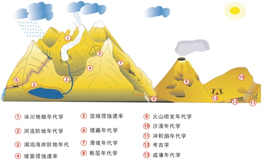 经过60多年的科学研究以及仪器分析技术的进步,就地宇宙成因核素在产率模型、暴露测年、侵蚀速率以及埋藏年龄等理论取得了长足的进步,其在百年到百万年时间尺度上,定量重建陆表地质过程方面具有独特的优势,已经在冰川地貌年代学、流域侵蚀速率、滑坡和断层年代学、火山喷发年代学、古人类学、河流和湖泊阶地年代学、埋藏年代学等方面广泛应用。