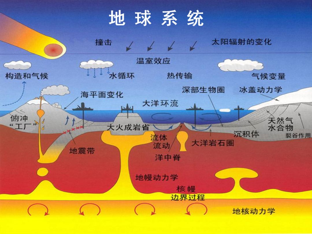 地球是一个物质与能量不断相互作用下的一个非常复杂的非线性系统,它可以被划分为几个基本的圈层,各圈层之间彼此交错相互影响,圈层之间及内部随时间的相互作用构成了地球的演化。