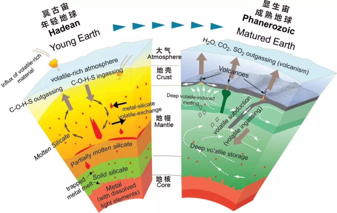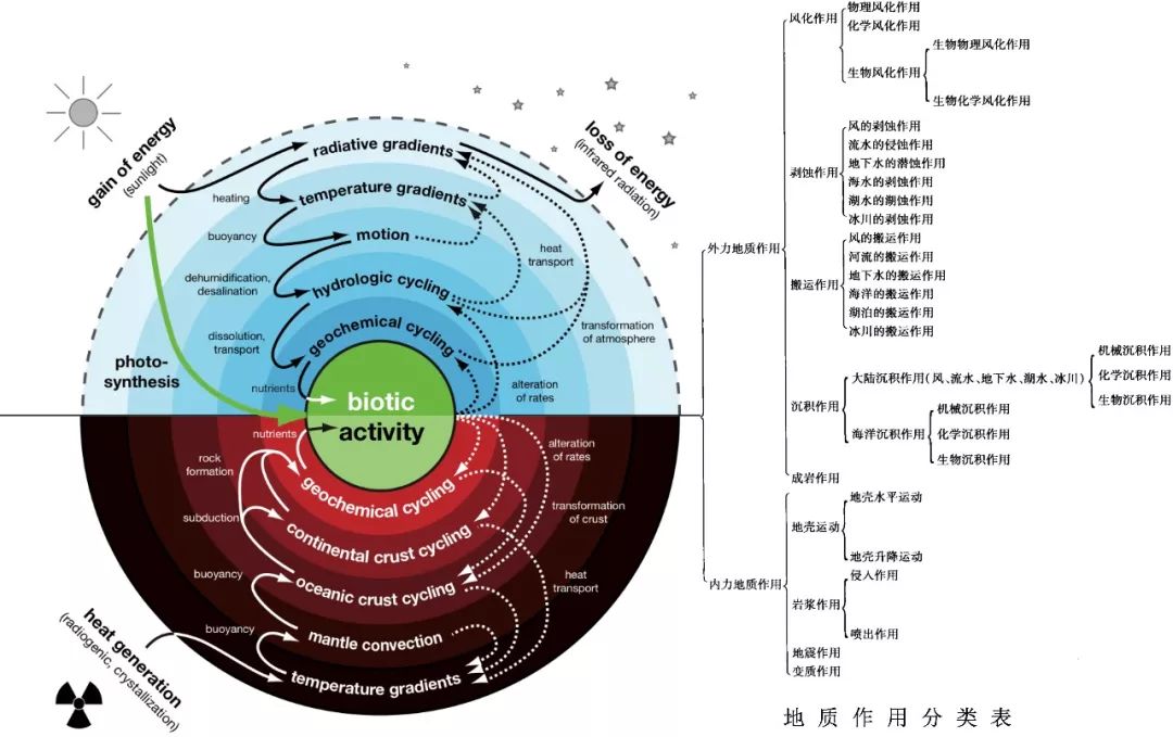 地球系统的演化主要受内动力地质作用和外动力地质作用的共同驱动,其主要有两个能量输入体系。一个是太阳在核聚变过程中向太阳系释放的太阳辐射能量,直接影响着地球气候变化、生物光合作用和岩石风化剥蚀等地球表层系统过程,是外动力地质作用最主要的能量供给;另外一个是地球内部放射性物质衰变、物质向地球深部迁移释放的重力势能和矿物结晶等释放的热量,对大陆漂移、海底扩张、板块运动、岩浆活动、地震作用、变质作用和构造运动等过程产生影响,是内动力地质作用最主要的能量供给。