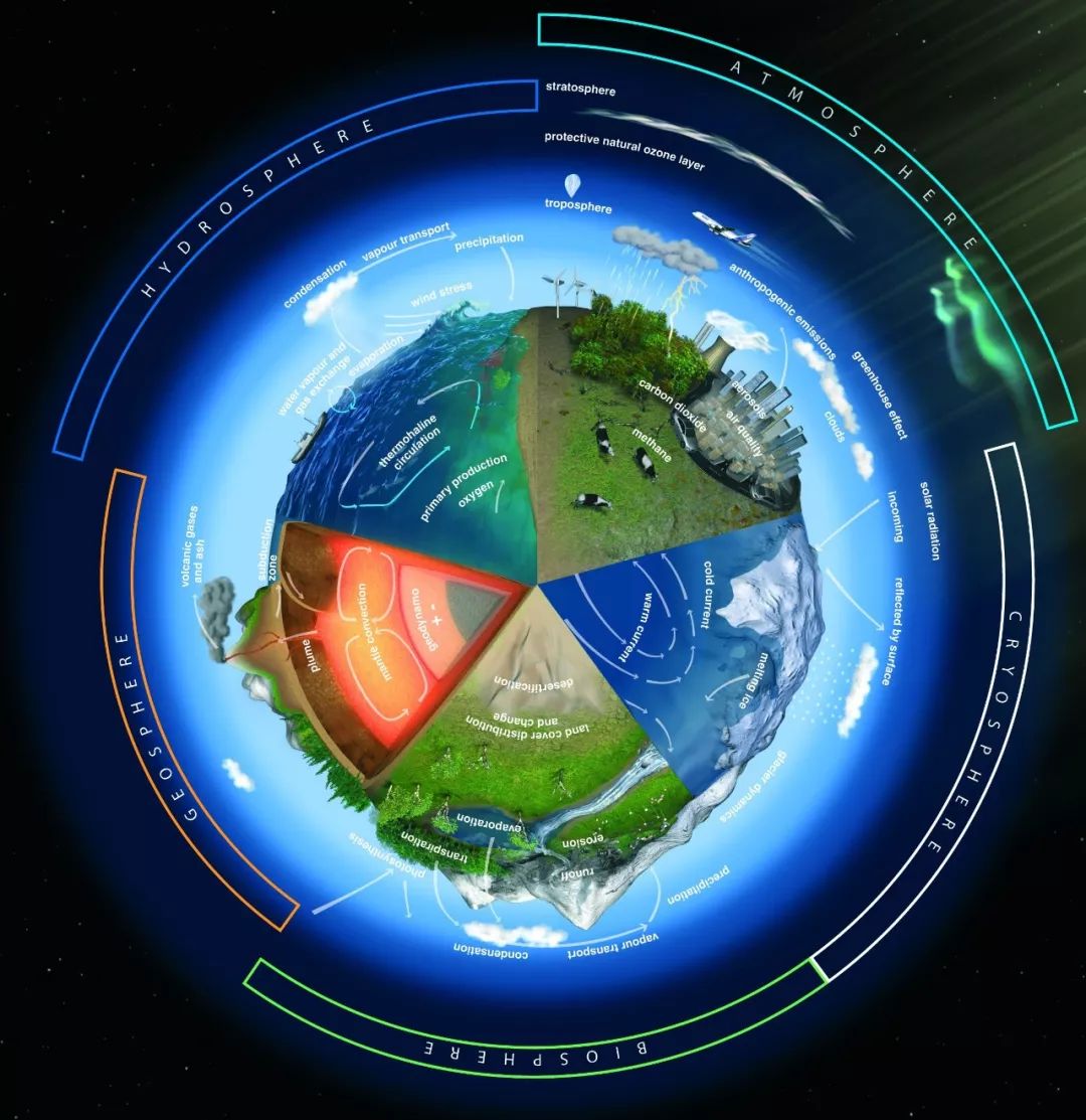 地球系统指由大气圈、水圈(含冰冻圈)、地圈(含地壳、地幔和地核)、土壤圈和生物圈(包括人类)组成的有机整体。地球系统科学主要研究各圈层的物质组成、结构分布、各圈层内部及之间一系列相互作用过程和形成演变规律,以及与人类活动相关的全球变化,为人类认知地球和绿色可持续发展提供科学支撑,以应对全球环境变化所带来的挑战。