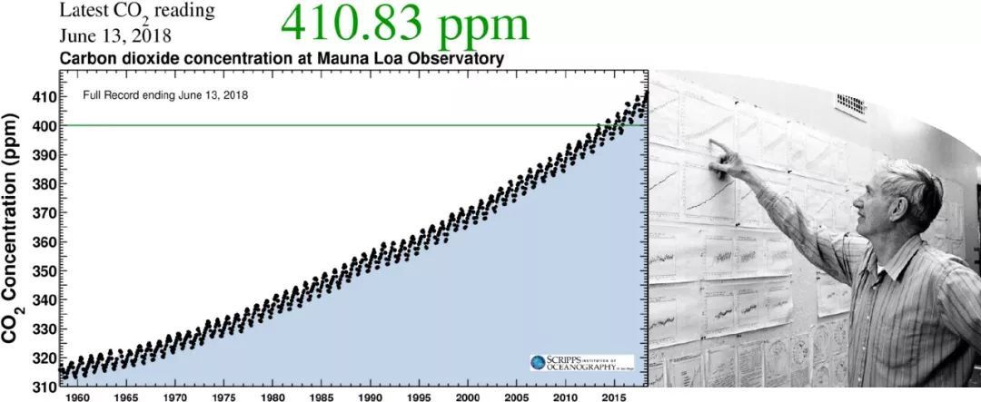 美国斯克里普斯海洋研究所的Charles David Keeling于1958年,在夏威夷Mauna Loa火山顶部持续采样,检测大气CO2浓度,发现CO2浓度已经由1958年的318ppm上升到目前的411ppm,是近80万年以来CO2浓度最高值,在冰期时CO2浓度最低只有185ppm,因此这条著名的大气CO2浓度变化曲线又名“Keeling 曲线”。CO2作为最主要的温室气体,是导致全球变暖的主要原因。