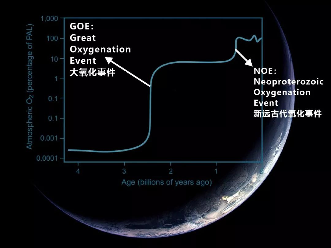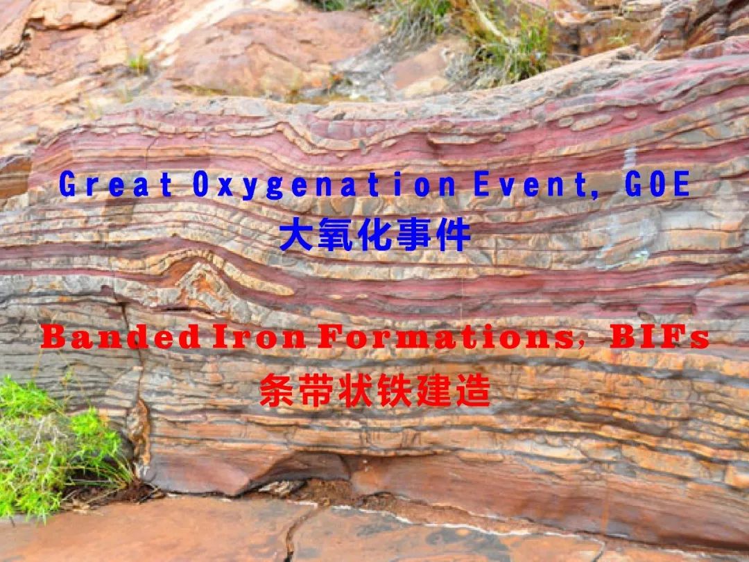 大约在24亿年前,大气中的游离氧含量(以相当于现代大气圈的分压表示,PAL=Present Atmosphere Level)突然增加,由一个极低的水平急剧增至现在浓度的10%,随后保持在一个稳定水平直至8.5亿年前,被称为“大氧化事件”(Great Oxygenation Event,GOE),8.5亿年前,氧气含量再次增加,被称为“新远古代氧化事件”(Neoproterozoic Oxygenation Event,NOE)直至达到约当前的水平。目前传统观点认为,海洋中的蓝细菌通过光合作用,使之前还原性的地表环境逐渐变为氧化环境。GOE是前寒武时期的一次重大地质事件,导致大量厌氧生物的灭绝,真核生物渐渐繁盛,多细胞生物逐渐出现并发展,改变了海洋化学环境,使得大量条带状铁建造(Banded Iron Formations,BIFs)形成(BIFs是全世界储量最大 、分布最广的铁矿类型),是地球表层系统的一次全面变革。
