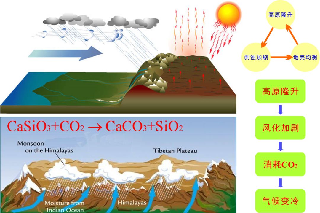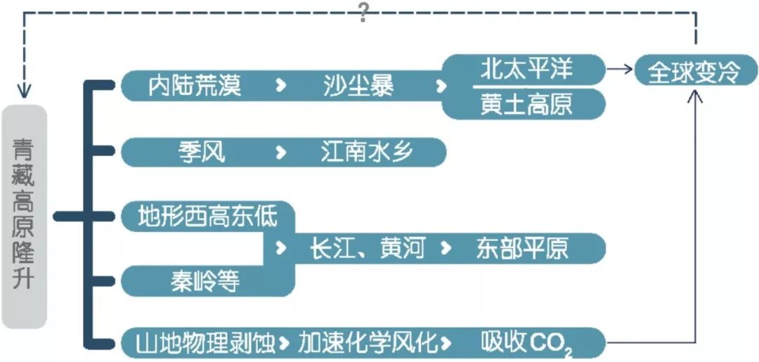 青藏高原的隆升,改变并形成了我国西高东低的地形格局(我国大陆至少到白垩纪为止仍为东高西低的地势);引起了亚洲主要河流分布和走向的变化,改变了陆地向海洋的淡水和沉积物输送状况;使地球上大面积的热带、亚热带和温带陆地海拔抬升到4500m以上成为高寒区,形成冰雪、冻土集中分布的“世界第三极”;使西风环流发生分支,夏季的南支气流和冬季的北支气流对季风具有加强作用;隆升后的高原在夏季成为大气的热源、冬季构成冷源,使亚洲大范围地区夏季盛行偏南风,从低纬海洋带来大量水汽,使我国南方成为湿润的鱼米之乡,而冬季盛行干冷的偏北风,构成强大的亚洲季风;对来自海洋的水汽构成地形屏障,在亚洲形成世界上最大的内陆干旱区;使得高原区物理和化学风化加强,吸收大气CO2,导致全球逐渐变冷。