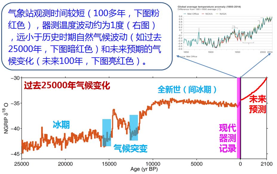 图4:气象站观测资料时间较短(100多年,粉红色部分),温度波动约为1度(右上图);远小于历史时期自然气候波动(如过去25000年,暗红色)和未来预期的气候变化(亮红色)