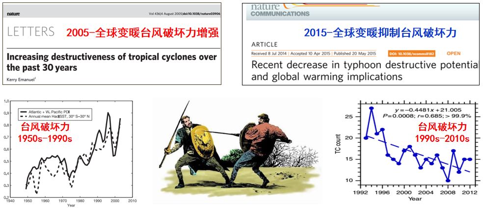 例如,2000年左右的一些研究发现北大西洋和西北太平洋台风的破坏力从1960s到1990s发生了增强,而这一时期恰好是全球快速变暖的时段,据此作者们推断出全球变暖可能导致更为严重的台风破坏力的结论,相关工作在Nature和Science上发表了多篇论文。但是很快被打脸,1990s以来的近20多年,全球变暖依然在持续,而观测的台风频率和破坏力并没有持续上升,反而出现了下降。出现这种矛盾的原因主要是现代观测资料的时段太短,难以将天气系统的长期趋势从短周期震荡中准确解读并分离出来。