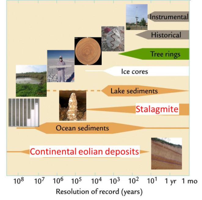 图7:除了器测资料,现有古气候载体的时间分辨率最高只能到月,无法用于研究发生在天-小时甚至更短时间尺度的古天气变化