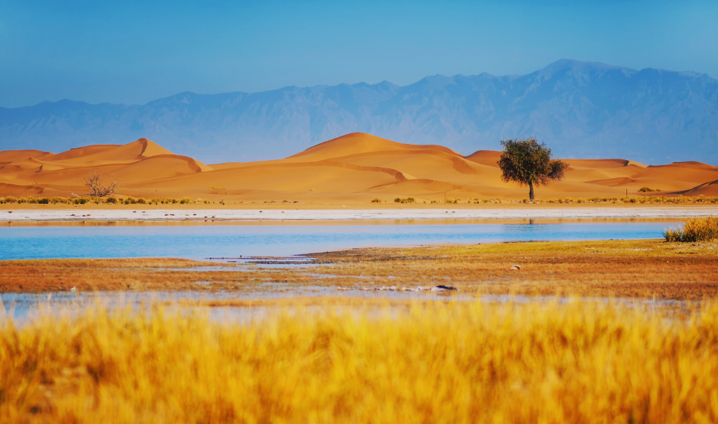 腾格里沙漠天鹅湖。是中国第四大沙漠,内部沙丘、湖盆、山地、平地交错。