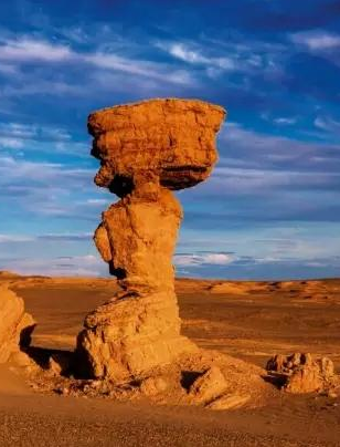 敦煌雅丹国家地质公园内的风蚀柱。风蚀残丘的砂泥层中垂直节理发育,经暴雨和风蚀作用,松软的沙土石被带走,原来的块状岩石就成为孤立的柱状岩石。