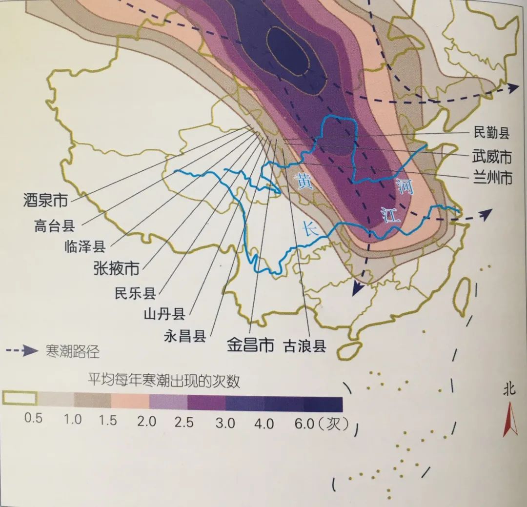 西伯利亚寒流入侵示意图。河西走廊是西伯利亚寒流南下的通道,冬季寒潮就是从这里向中国西北、华北及东南沿海等地分散的。