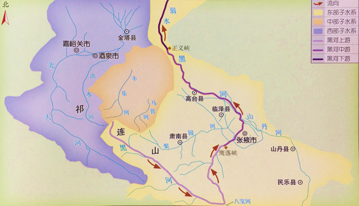 河西走廊段黑河流域示意图。黑河流域内形成了200多千米长的天然绿色屏障,还浇灌出了“金张掖”这一富饶之地。