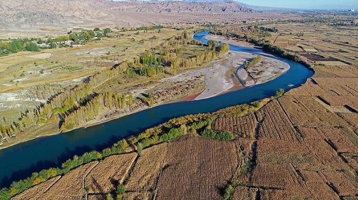 黑河张掖甘州区一段。黑河自东向西横贯区内,沿河地带在流水冲击作用下形成了自东南向西北倾斜、呈东西向狭长延伸的平原地带,即黑河冲积平原。这里土质肥沃,水源丰富。
