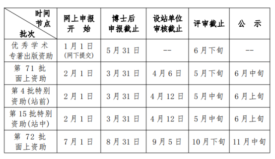 根据“中国博士后科学基金资助指南”,2022年度资助项目及申报时间如下: