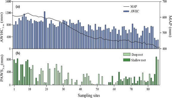 结果显示,沿植被恢复和降水减少的梯度,土壤有效水容量的平均值为762.9 毫米,植物有效水储量先减少后增加,平均值为257.3 毫米。不同土层深度,土壤有效水容量差异显著,与气候、土壤指标显著相关。对比不同植被类型发现,植物有效水储量占土壤有效水容量的比例很低。在450-550 毫米降雨区和以粉壤土为主的地区,土壤有效水容量和植物有效水储量具有较高的变异性。进一步分析发现,在450-550 毫米降雨区,种植深根系植被的土壤有效水饱和度低于浅根系植被。本研究深化了对不同降雨区、植被特征和土壤类型下土壤有效水容量和植物有效水储量的空间变化的认识,对黄土高原有限的土壤有效水资源管理、植被优化配置模式具有一定参考意义。