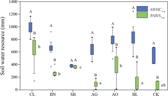 图 2 不同植被类型下土壤有效水容量和植物有效水储量特征